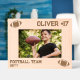 Mostre seu orgulho pelo seu jogador de futebol americano favorito exibindo sua foto neste quadro gravado de madeira com um tema de futebol americano, personalizado com o número de jogador, o nome e o nome da equipe, e também no ano com bolas de futebol gravadas nos cantos. O quadro fotográfico do tema futebol americano personalizado com nome, número e nome do time para mostrar o melhor momento do seu filho no campo, foi memorializado em um instantâneo perfeito e mostrado neste quadro fotográfico personalizado com texto personalizado e ícones de futebol. Um excelente adicional para a sua mesa de trabalho, para o quarto do seu filho ou para os avós que, evidentemente, estão igualmente orgulhosos do seu neto estrela de futebol.