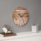 Este relógio rústico redondo tem uma madeira marrom média olhando para o fundo com algarismos brancos em uma matriz caída, embaralhada no fundo do relógio com as palavras, "Quem se importa? Estou aposentado no topo. Se precisar de assistência, envie um e-mail para niteowlstudio@gmail.com.