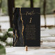 A borda esquerda desta elegante e moderna placa de número da mesa de casamento apresenta uma borda de agata preta aparada com falsa brilho dourado. A palavra "mesa" aparece em um guião de escrita manuscrita dourada sobre fundo preto. Adicione os nomes dos seus convidados que estão atribuídos a cada mesa.