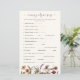 O Nursery Rhyme Baby Game apresenta flores silvestres de cor d'água pintadas à mão em tons de burgundy, ouro, creme e roxo, complementadas por um verde exuberante. Ideal para qualquer estação, as flores silvestres são organizadas em um buquê lateral atordoante, oferecendo uma estética moderna e fresca. Com um padrão arrojado no verso, este cartão de jogo combina versatilidade e sofisticação, fornecendo uma atividade divertida e na moda para os convidados do chá de fraldas aproveitarem.