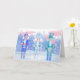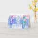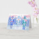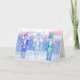 Três bolachas jubilantes, com presentes encantados da estação de inverno, não se enfartam em meio a uma floresta pastel beijada pela geada. Ilustração original do artista Noël Snow. O dentro do cartão diz: "Feliz Natal" em língua alemã.