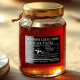 Rótulo impermeável de Fatos de Nutrição de Mel com texto branco e esticado sobre fundo preto com pequena ilustração de abelhas.