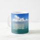 Comece seu direito do dia livre com nossa caneca de café com uma pintura cénico de relaxamento de uma nuvem branca macia em um céu azul claro refletido em um oceano calmo de turquesa.