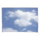 Nuvens brancas e fofas estão espalhadas por um céu azul brilhante. A imagem transmite uma sensação de paz e abertura.