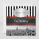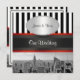 NY City Skyline BW Black & White Stripe Invitation Collection - Convite personalizável para casamento Convites e acessórios com uma visão icônica do horizonte de Nova Iorque do topo do Rockefeller Center, com uma foto em preto e branco do Edifício Emp Rua, em baixo Manhattan, incluindo o World Trade Center. Eles também apresentam um padrão de fundo listrado preto e branco e uma fita vermelha e preta, bem como uma etiqueta de gradiente branco com a escolha de uma moldura de cor prateada ou dourada. (Nota: alguns acessórios coordenadores de companhia podem não ter a foto ou os elementos adicionais de design.) Este produto faz parte de um conjunto de designs correspondentes que são facilmente personalizáveis para muitas ocasiões e eventos. Se você precisar de placas RSVP separadas, Notas de agradecimento, Carimbos, ímanes ou outros acessórios, por favor verifique nossas outras listas. Se você não vir um produto correspondente que esteja interessado ou gostaria de ver este 2012 ©NYCisMyMuse Todos os direitos reservados