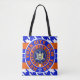 Tote Bag do Ombro branco com círculos concêntricos azuis, brancos e laranja design acima de um retângulo azul e laranja com "NOVA IORQUE, NOVA IORQUE CENTER DO UNIVERSO" com O Selo do Excelente de Nova Iorque no centro e Y-NOT-ME com design houndstooth no fundo. Este design é um grito para (A Grande Maçã), Nova Iorque, Nova Iorque.