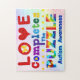 Citando o Autismo Inspiracional, O Amor Completa O Quebra-cabeça, com quebra-cabeça Autismo coloridos e uma bela borboleta para apoiar as crianças autistas e suas famílias.