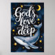 Uma ilustração aquática de uma baleia nadando sob um céu noturno estrelado. A baleia tem algumas estrelas nas costas. Acima da baleia está o texto "O Amor de Deus é Profundo" escrito em escrita manuscrita. O fundo contém algumas estrelas flutuantes e uma lua crescente