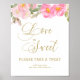 Mesa de sobremesa floral ou sinal da mesa de favor com letra "com amor é doce, por favor, pegue um tratamento". Você também tem a opção de adicionar texto personalizado, como .. com amor da futura Sra. [sobrenome]. Este design em aquarela feminino tem flores rosa e douradas com um toque de verde. Apresenta letras e tipografia elegantes à mão em dourado, com "Amor" e "Doce" escritos à mão em caligrafia espiralada. Por favor, navegue pela minha loja para encontrar itens correspondentes.
