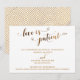 A distinção deste conjunto se deve à moderna fonte de texto adornada com corações e um efeito de folha de ouro falso usado para frases de destaque. Se você está na posição de precisar informar aos seus convidados de casamento que está adiando o casamento, aqui está uma opção elegante. Nesta peça, a bela fonte de texto foi usada para criar um gráfico que diz "o amor é paciente". Use os campos do modelo para adicionar seus detalhes pessoais e tornar este design moderno e único seu. O fundo branco pode ser alterado para qualquer cor que você preferir. A parte de trás foi coberta com um padrão dourado repetido que permite que a cor escolhida seja vista entre as linhas. Por favor, entre em contato para qualquer solicitação especial ou para obter ajuda na personalização. // 80 //