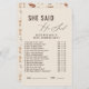 Celebrar a noiva a ser com o nosso encantador Chá de panela Que Ele Disse Que Ela Disse Jogo! Os convidados gostarão de adivinhar quem disse ou fez o quê com estas perguntas divertidas e perspicazes sobre o casal feliz. Apresentando belos designs de flor silvestre, este jogo é a adição perfeita às suas festividades de chá de panela. É uma maneira deliciosa de aprender mais sobre noiva e noivo enquanto cria momentos memoráveis. Que a diversão comece e veja quem sabe melhor o casal!
