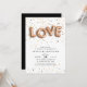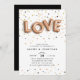 Os convites de festa de noivado únicos contêm "LOVE", soletrados em balões de rosa-ouro, sobre um fundo de rosa-ouro, ouro e confete preto. Personalize com seus detalhes de festa de noivado em letras negras modernas. Convites inverso a preto sólido.