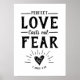 Escritura Elegante de Estilo de Caligrafia Verso Design Emblem a preto sobre fundo branco com palavras, "O Amor Perfeito Desfaz o Medo." Bíblia verso é 1 John 4:18