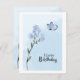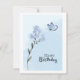 Um delicioso cartão de aniversário com uma delicada borboleta azul que voa entre um aglomerado de flores azuis vibrantes. O fundo é uma sombra calmante de azul. O cartão também apresenta a mensagem "Parabéns" em uma fonte preta e cursiva.
