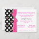 O bebê à moda polvilha o convite do chá. Os gráficos bonitos de flores cor-de-rosa e verdes em um fundo preto, com bolinhas brancas decoram o lado esquerdo deste convite branco. Gráficos de uma fita e de um arco cor-de-rosa bonito, funcionamento vertical dividindo a área de texto branca contínua do fundo da flor e das bolinhas. O texto no rosa e no preto está pronto para personalizar para seu evento do chá de fraldas. Convite que bonito a mamã a ser salvar para nunca, com as lembranças do seu bebê novo.