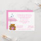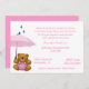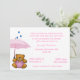 O bebê doce polvilha o convite do chá. Os gráficos dos desenhos animados de um urso de ursinho marrom, em macacões cor-de-rosa e em guardarar um guarda-chuva cor-de-rosa, decoram o lado de inferior esquerdo deste convite branco. Os gráficos de três gotas da chuva estão caindo sobre o guarda-chuva. O texto no rosa está pronto para personalizar para seu evento do chá de fraldas. Convite que bonito a mamã a ser salvar para nunca, com as lembranças do seu bebê novo.