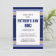 Estas características de design corajosas, masculinos azuis e listras bege em um fundo dos azuis marinhos. O texto customizável para o tipo do evento do dia dos pais (CHURRASCO, cookout, refeição matinal, comensal, partido, etc.) e o lugar, o RSVP e os detalhes do contato publica-se dentro de uma área branca afiada ouro no centro em azuis marinhos populares, masculinos e em tipografia do preto na parte dianteira do cartão. A parte traseira do cartão caracteriza as mesmas listras azuis e bege corajosas.