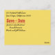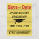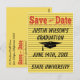 Estilo moderno amarelo brilhante, laranja e preto de memo Salve o cartão postal Data. Design inclui um gráfico preto de chapéu de graduação. Perfeito para anotar notas sobre sua formatura. Parabéns!