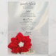 Personalize o menu vermelho festivo da poinsétia e do casamento no inverno das pérolas do branco com os detalhes da refeição que você servirá em seu almoço do chá de panela de dezembro, comensal da recepção do casamento ou refeição matinal do casamento do cargo adicionando a salada ou o primeiro curso, entrada ou segundo curso e sobremesa ou terceiro curso. Personalize-o com os nomes dos noivos, do lugar do local de encontro e da data de evento. Este menu invernal feito sob encomenda elegante do casamento caracteriza uma fotografia floral de uma flor vermelha da flor da poinsétia de dezembro, de uma colar branca da pérola e de um véu nupcial com um fundo branco do cetim.