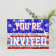 Design de brilho da bandeira dos Estados Unidos inspirado brilhando sequins. Convite com um cinza vermelho, branco, de prata e um design customizável azul para que você personalize com seus próprios texto, imagens e ideias. A imagem criou usando técnicas digitais por Jess Perry. Não contem o brilho real ou os sequins.
