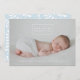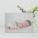 Cartão de férias moderno com a frase "Glory to the newborn king" (Glória ao rei recém-nascido) num contorno de retângulo branco moderno, ou a sua própria saudação personalizada, se preferir. Sua foto é exibida atrás. A camada de gradiente da cinza ajuda o texto branco a aparecer em placas mais leves e pode ser excluído ou reposicionado, se desejar. A parte de trás é um padrão foliar de inverno em branco e azul claro, mas a cor azul pode ser alterada para qualquer cor que você quiser.