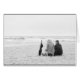 O cartão mostra homem e mulher sentados na formiga da praia olhando para o mar