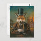 Este cartão de posto retrata uma raposa vitoriana afiada no vestido de cavalheiro em frente a uma mansão em chamas.