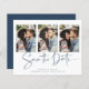 BUDGET Modern Manuscrito Salve a data Cartão com fotos múltiplo em azul e branco clássico em uma fonte elegante e que evoca um toque romântico manuscrito. Projetado para usar três de suas fotos favoritas para personalização adicional. Adicione facilmente seus nomes e datas para um design verdadeiramente personalizado. **O nosso documento sobre o ORÇAMENTO é mais pequeno e delicado, mas ainda é bonito!** Se precisar de assistência ou de elementos correspondentes, contacte-nos em cedarandstring@gmail.com.