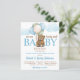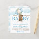 Chá de fraldas de ursinho de peluche esperando ursinho bonitinho com balões orçando modelo de Convite, ursinho em uma jaqueta e calças com vários balões e nuvens cores azul e castanho muda.