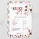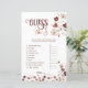 Envolva seus hóspedes com este divertido e interativo jogo de chá de fraldas "Adivinhem o Preço", uma atividade perfeita para qualquer celebração de bebês. Apresentando sotaques florais elegantes no outono em tons ricos de outono, este cartão de jogo desafia os hóspedes a adivinhar o custo de itens essenciais para bebês. É uma maneira divertida de testar seu conhecimento e provocar conversas vivas, acrescentando um toque encantador às suas festividades de chá de fraldas.