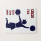 O cheerleader na silhueta salta com quebra-cabeça