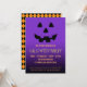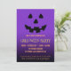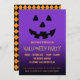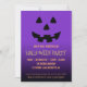 O convite da festa de Halloween, com um rosto de lanterna de abóbora em um dramático gradiente roxo e fundo preto. No outro lado da placa há um padrão de verificação preto e laranja.