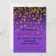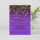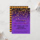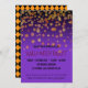 Convite para festas de Halloween, com pílulas de jack o'lanternas a chover num dramático gradiente fundo roxo e preto. No outro lado da placa há um padrão de verificação preto e laranja.
