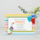 O convite de aniversário da jovem criança à moda muito colorida feito um multi teste padrão horizontal colorido da listra. Os gráficos de balões azuis e vermelhos e de um ganso branco lunático com anéis coloridos do brinquedo em torno dele são pescoço, decoram os lados da área de texto branca. O texto feito em multi cores está inteiramente customizável e pronto para personalizar para o aniversário da sua criança.