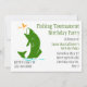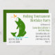 O convite de aniversário à moda da pesca feito no branco, com gráficos da silhueta de um verde coloriu o salto baixo da boca grande, da água, após um inseto alaranjado. O texto no verde e no preto está pronto para personalizar para seu dia especial. Grande ideia do partido para o pescador ávido.