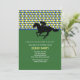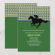 Um convite esportivo perfeito para uma festa do Kentucky Derby ou qualquer ocasião relacionada a corridas de cavalos. O cartão apresenta um padrão de argila azul, verde e branco no topo, um fundo verde sólido e um jóquei de silhueta sobre um cavalo em preto.O convite é fácil de personalizar com seu texto, fonte, cor da fonte e escolha de seis tipos de papel.