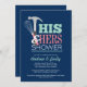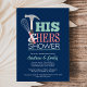 Este convite para o chá apresenta as ferramentas dele e dela para toda a casa. Cores brilhantes, incluindo marrom, rosa e aqua.