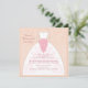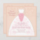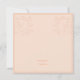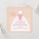 Um convite quadrado com um fundo de pêssego, abstrato, floral e espiral. O vestido de noiva em destaque tem um corpo em forma de coração e repete o desenho abstrato na saia em forma de sino. A noiva tem um buquê floral na frente. Bem adaptado para chás de panela ou almoços de damas de honra.