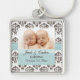 Personalize este chaveiro azul e marrom bonito da foto do bebê do damasco com uma imagem de seus gêmeos recém-nascidos, e personalize-o com seus nomes e data de nascimento. Isto faz um presente bonito para uma mamã ou uma avó nova dos gêmeos. Design por Chrissy H. Estúdio, LLC.
