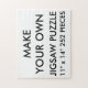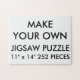 O costume imprimiu personalizou o modelo do vazio do QUEBRA-CABEÇA de SERRA DE VAIVÉM de 252 PARTES - 11" x 14" (252 partes). O design, cria, faz seus próprios. Impressão de cor completa vívido de seu foto ou design. Inclui a caixa de presente bonita com a imagem do quebra-cabeça igualmente impressa na tampa. Estoque resistente do cartão, montado no cartão, superfície limpeza-limpa fácil. Lotes dos quebra-cabeça alternativos do tamanho disponíveis. Melhor para o aniversário dos miúdos ou das avós ou os presentes do Natal e para fanáticos do quebra-cabeça de serra de vaivém. Aviso: Nao apropriado para crianças sob 3.