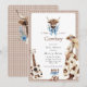 Comemore a chegada do seu cowboy com este charmoso convite para chás de fraldas. Apresentando uma vaca branca Highland adornada com delicados florais azuis e um chapéu doce de vaqueiro, esta design captura um tema ocidental rústico, mas elegante. O convite exibe com destaque "A Little Cowboy is due!" junto com espaço para o nome da futura mãe, detalhes de eventos e um código QR para RSVPs. Perfeito para um chá de fraldas temático rústico ou cowboy, este convite dá um tom quente e convidativo para sua celebração especial.