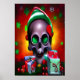 Um crânio com um gorro verde de Natal num fundo vermelho, amarelo, verde e presente de Natal em frente ao crânio. Esta é uma arte gerada por IA.