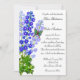 O design original das belas artes de uma traça espanhola verde elegante da lua no jardim azul do Delphinium floresce contra um fundo branco pelo desenhista Carolyn McFann do estúdio de ronrom de dois gatos impresso em convites customizáveis do casamento.