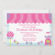 Enfie sua festa de aniversário doce da menina fora do direito com nossa caracterização doce do convite do aniversário de criança dos deleites um toldo das lojas dos doces na listra cor-de-rosa & roxa com doces, um pirulito e uma máquina da bola de goma. Bonito para uma primeira festa de aniversario de meninas, festa de aniversário dos doces, doces festa de aniversário ou festa de aniversário do verão. Visite nossa loja para ver o outro obrigado bonito dos convites de festas de aniversários & da harmonização você notas, etiquetas & selos postais. Design de Blackleaf do ©