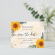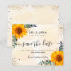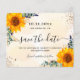 Um casamento de moda Salve a Data. Um fundo de cor aquosa de ouro decorado com girassóis, folhagem de eucalipto, folhagem de ouro e pó de ouro falso. Personalize e adicione uma data, nomes e texto. O texto: Salvar a Data é gravado com um script de estilo com letra de tendência grande com alternâncias.