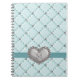 Tome notas com este o caderno espiral acolchoado do coração do cristal de rocha do azul esverdeado falso hued claro bonito e sofisticado que pode ser personalizado com seu inicial ou monograma. Este jornal monogrammed bonito com um teste padrão bling da cruz e do diamante dos criss é elegante e na moda com seus fita e pendente e broche dados forma coração da prata como o design. Trabalhos de arte e © Chrissy H. Estúdio do design, LLC. Todos os direitos reservados.