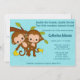 Caracteriza os macacos adoráveis do menino que balançam em um ramo. Caracteriza máscaras do tema AZUL da cor. Este convite do chá de fraldas de MonkeyHutDesigns coordena com todo o tema do macaco do safari de selva e é grande para um MENINO. (Design#: ISMO-0040)