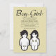 Um convite chique, moderno que caracteriza uma criança masculina e fêmea com órgãos acentuados.