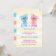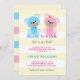 O género revela o convite do chá de fraldas que caracteriza dois caráteres bonitos do urso de ursinho, um azul e um rosa. O fundo tem listras amarelos pálido do género e brancas neutras. Este convite é bonito e colorido.