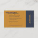 O Cartão de visita do Chef Pessoal Gourmet de ouro amarelo e azul escuro é elegante e moderno, que exibe um conjunto de refeições de azul escuro e branco; uma colher de ouro e garfo; e uma decoração de plantas de folha verde. Na frente, o nome da empresa na placa branca é enfatizado enquanto o serviço está na vertical. No verso, é mostrado o nome comercial, o local, os dados de contato, o site e o profissional ou proprietário.